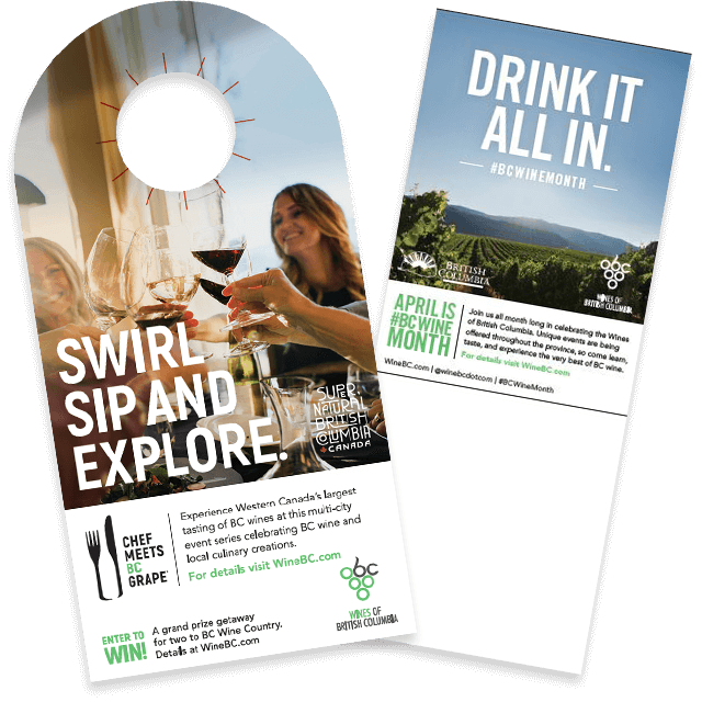 Billfolds, necktags, backer cards, case wraps, window clings, floor decals, coasters, magnetic buttons, social media images and the official logo of BC Wine Month – we are making POS materials available to you for FREE. Click here for the print version. For physical POS order here or ask your winery agent.
