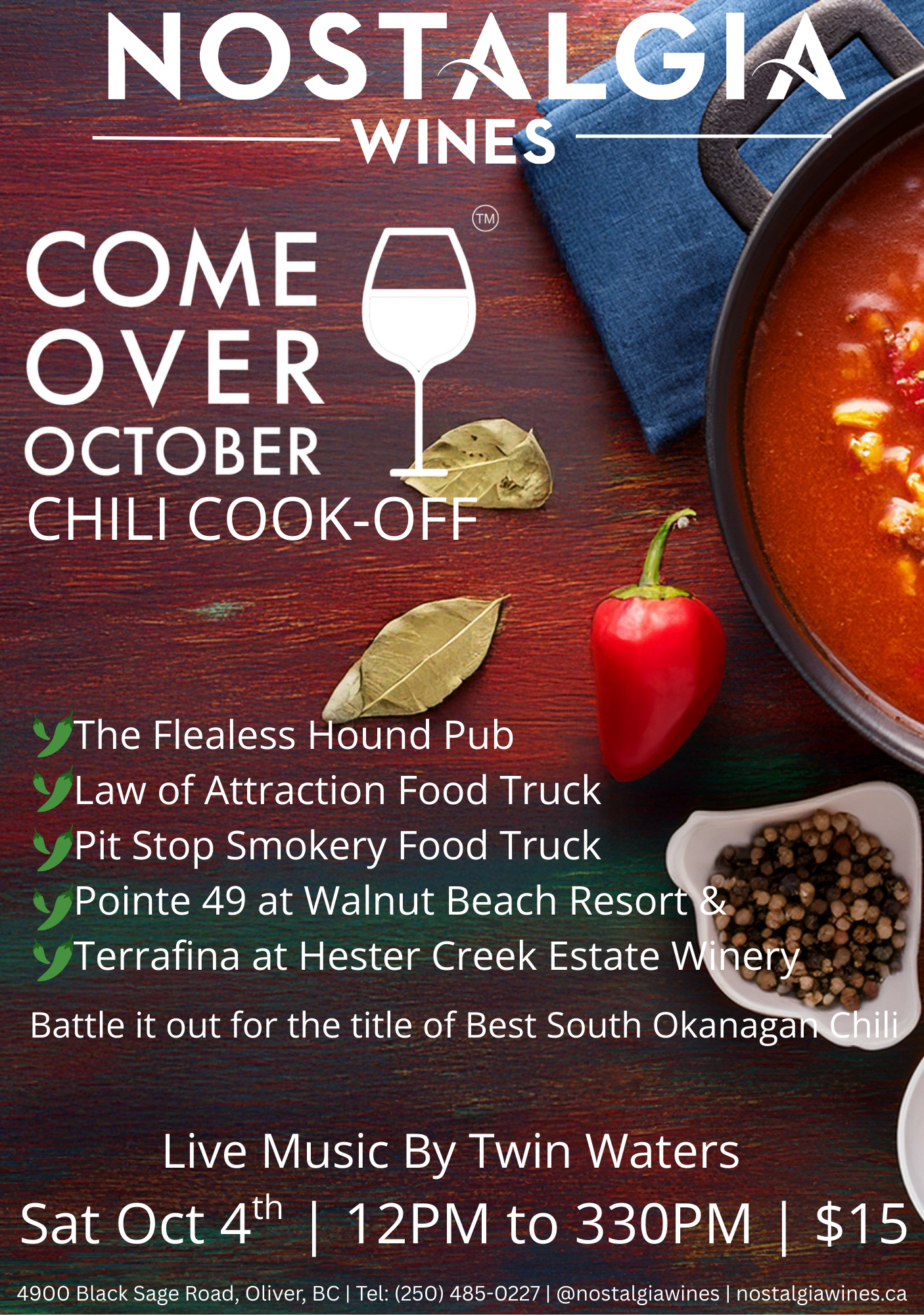 Pots will bubble, spices will fly, and taste buds will be tested. Bring your appetite and your game face—bragging rights are on the line. Come over October! Join us for a cozy, flavour-packed afternoon at Nostalgia Wines as we host our first-ever Come Over October Chili Cook-Off! Five amazing chefs from local restaurants and food...