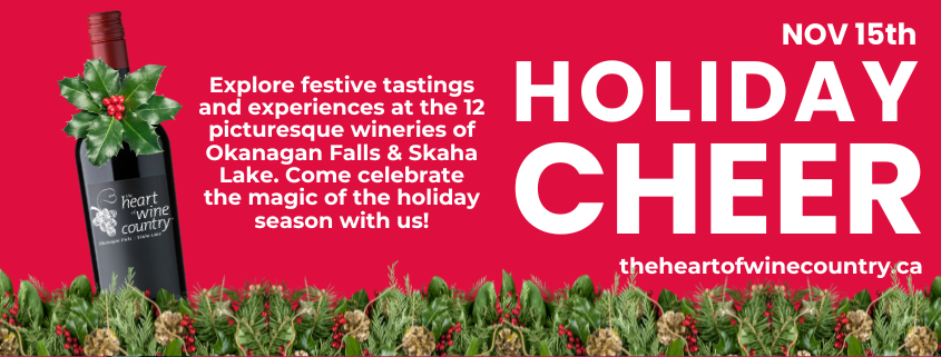 JOIN US for THE HEART OF WINE COUNTRY™ 13th Annual Holiday Cheer Open House! From 11am to 4pm explore festive tastings and experiences at the 12 picturesque wineries of Okanagan Falls & Skaha Lake. Shop local and visit us on Saturday, November 15th, with some wineries extending events into Sunday as well. Come celebrate the...